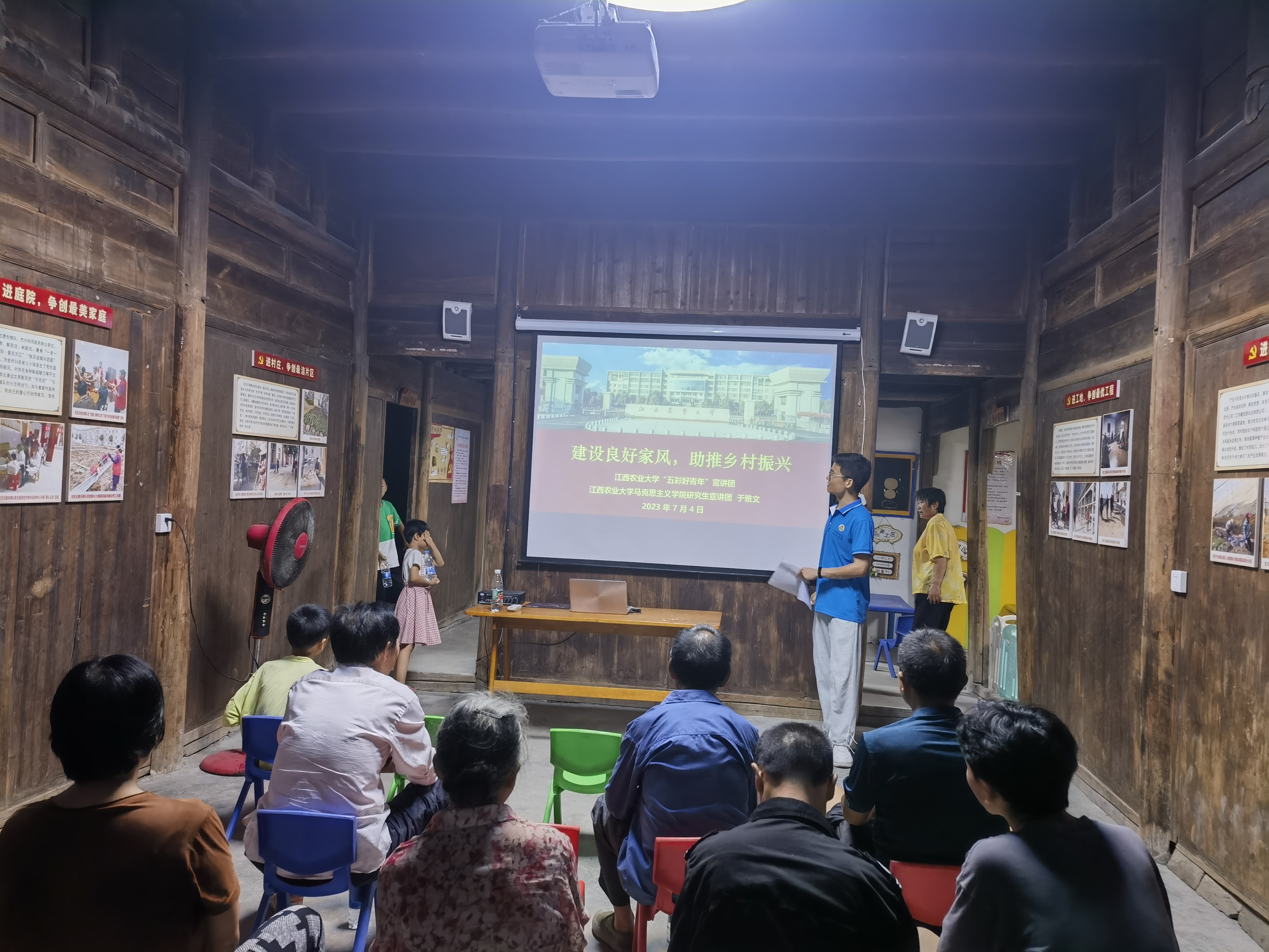 宣讲团紧密将党的创新理论宣讲与自身实践锻炼相结合,让理论宣讲既“接天线”又“接地气”。宣讲团成员于雅文社会实践期间在新干县沂江乡,以《习近平的家风故事》为小切口,讲述了习近平总书记关于家风建设的重要论述,通过进村入户的宣讲方式号召大家以良好家风建设助推乡村振兴。宣讲团成员徐嘉玲,暑期“三下乡”社会实践来到红军长征先遣第一村——遂川县横石,在宣讲前印制好红色教育宣传册进行分发,向当地村民、游客开展“零距离”面对面宣讲。朱惠玲在奉新猕猴桃科技小院实习期间,以《实现中华民族伟大复兴是近代以来中华民族最伟大的梦想》为题向园艺2002班全体同学开展宣讲,号召同学深入学习习近平总书记给中国农业大学科技小院的学生重要回信精神,积极练就兴农本领,为实现中华民族伟大复兴贡献青春力量。