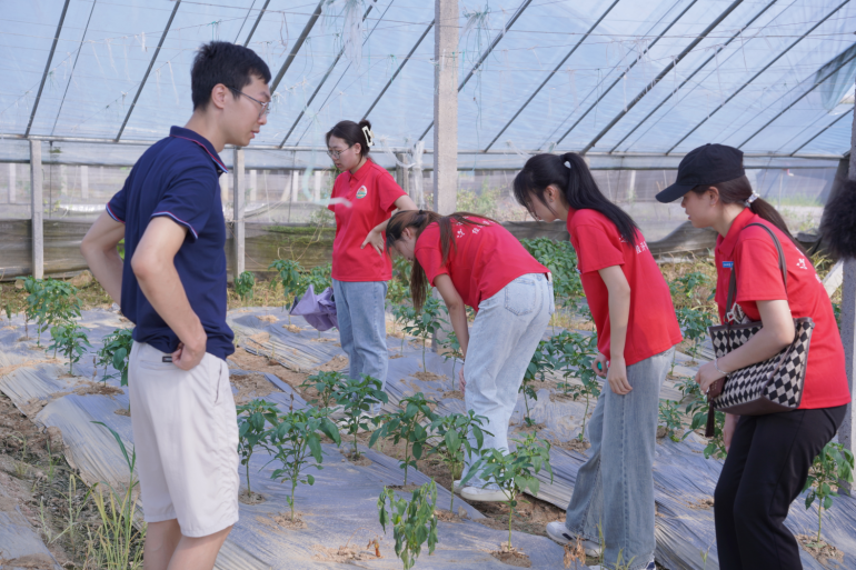 随后,服务团一行在村支记带领下前往畲族蓝家蔬菜大棚基地进行参观学习,实地学习了当前蔬菜种植品种及生长情况,进一步了解了大棚蔬菜每个季节的生长特点、栽培管理技术以及病虫害的防治措施。在学习过程中,成员们也根据自己的所见所闻,边学边问,在杨书记的耐心解答与指导下,同学们对当地蔬菜产业的发展和振兴有了更深层次的了解。