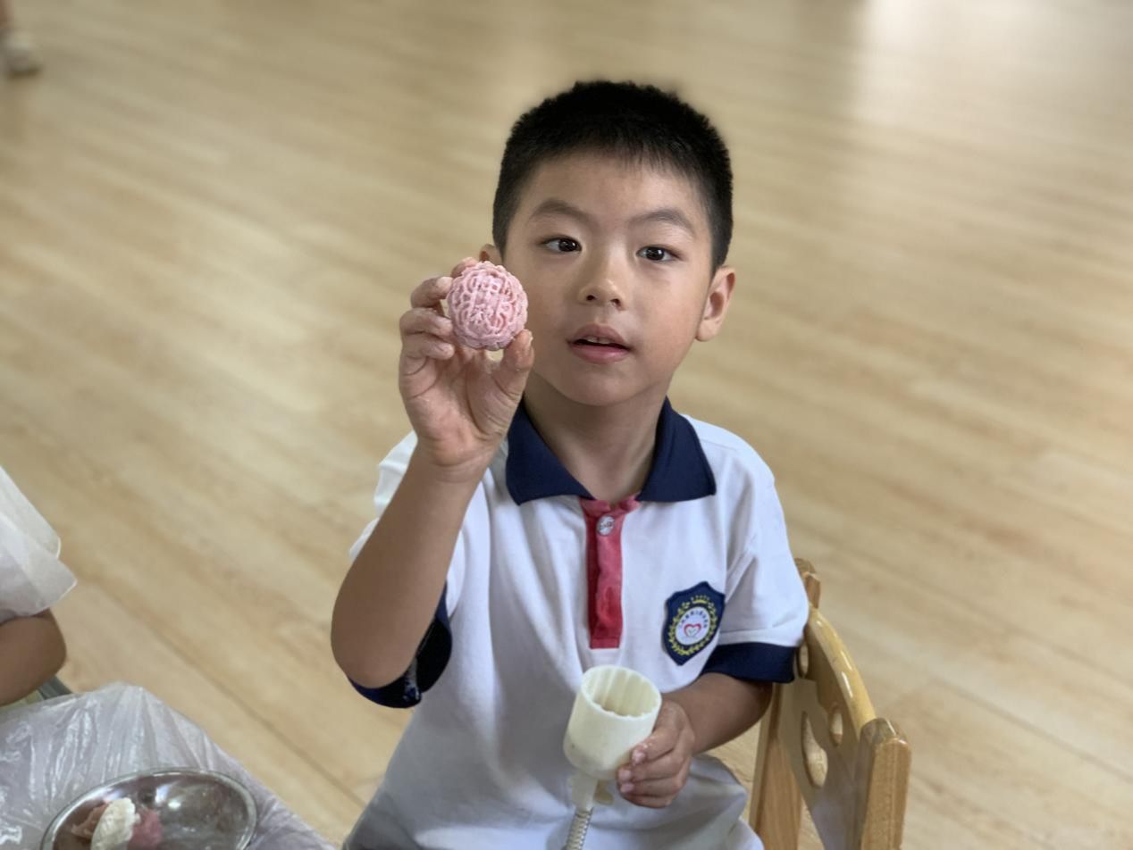 大班的孩子们用搓、团、压、捏等方式制作各式各样的月饼,一款款独特充满浓浓爱意的冰皮月饼就做出来啦,每个人的脸上都洋溢着幸福的微笑。