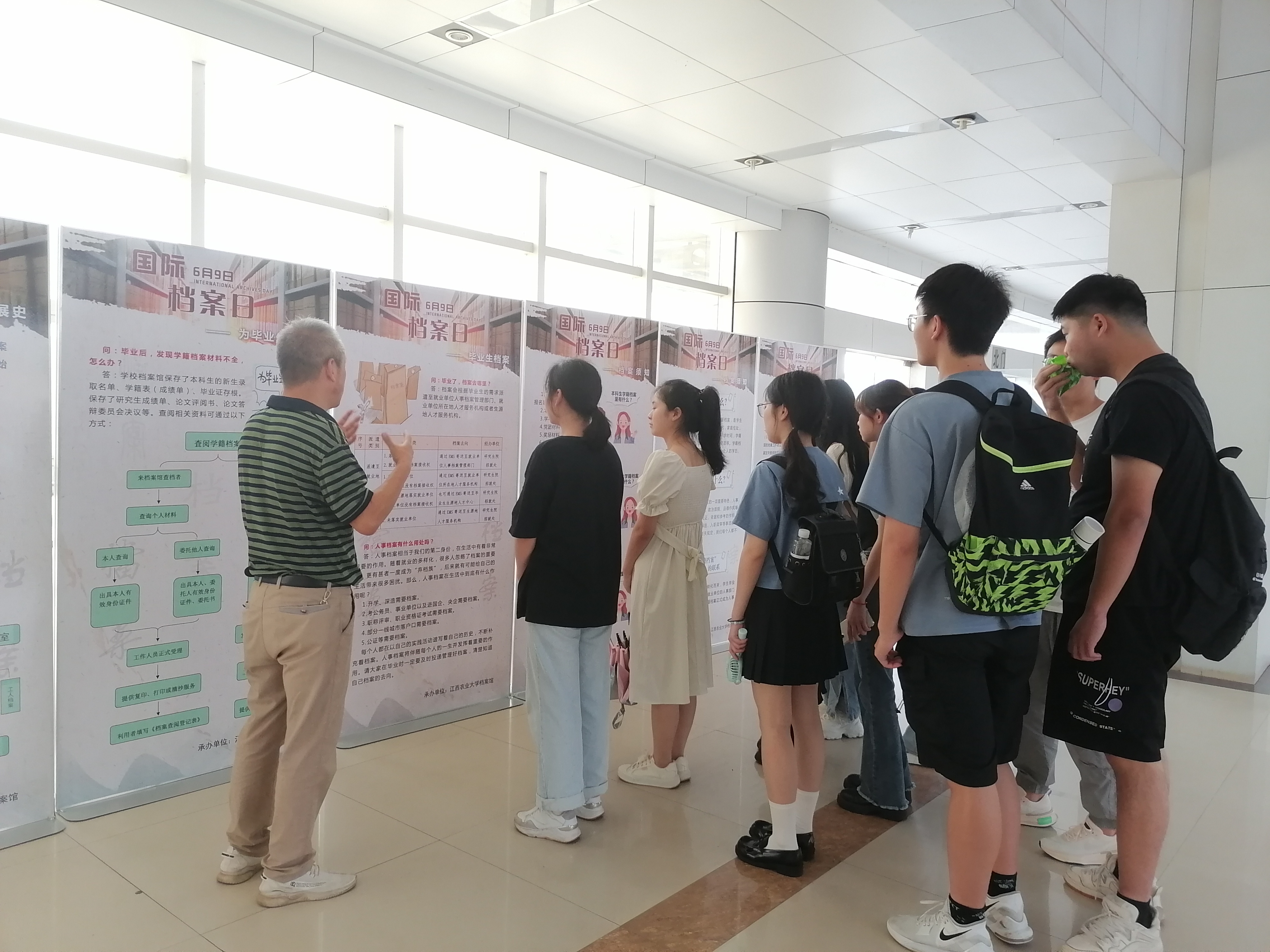 6月9日,在先骕楼北楼大厅,举办了主题为“6·9国际档案日——档案连接你我他”展览,展览从档案须知、毕业生档案、为毕业生服务、档案馆发展史等方面向广大师生宣传普及档案知识。展览一经展出就吸引了大量学生驻足观看,不少学生表示还是第一次这么全面地了解学校档案馆和人事档案知识,尤其是“毕业生档案”和“为毕业生服务”内容,为毕业生送来了一场有关档案知识的“及时雨”,为他们精准了解了个人档案派遣、转递、利用等提供了指导。