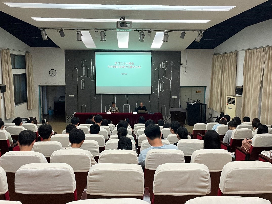 5月26日晚,生物科学与工程学院开展党的二十大精神宣讲,学校“金扁担”宣讲团成员刘步英应邀作《学习二十大报告,为中国农业现代化建功立业》专题报告,学院党委负责人、各学生党支部书记、支部委员和学生党员、发展对象参加了学习。