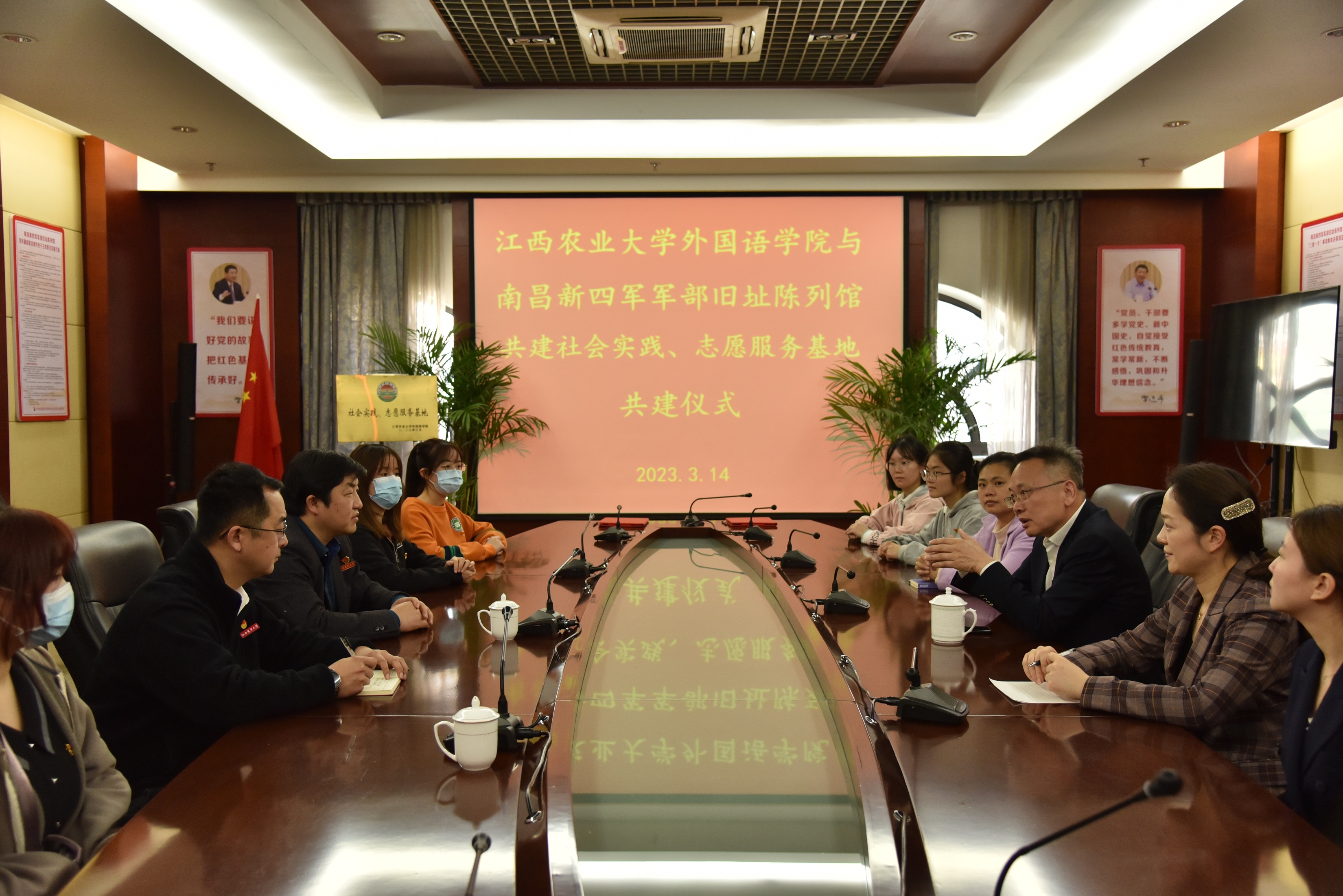 外国语学院负责人与南昌新四军军部旧址陈列馆熊河水馆长及馆内科室负责人就开展共建活动的志愿服务、支部建设项目具体实施方案进行了交流沟通,双方一致表示要在“请进来、走出去”路径上着力加强红色文化交流,共享红色资源,结合学校与陈列馆的优势、特色加强合作,传承红色基因。