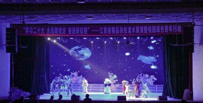 调皮的猴子在舞台上上蹿下跳、灵巧的小白兔随着音乐扭动身体、憨态可掬的小熊把蜂蜜罐子抛向天空……3月10日晚,在校大礼堂举行了“学习二十大,永远跟党走,奋进新征程”——江西省精品杂技魔术展演暨校园绿色青年行动。活动邀请了江西省杂技团、江西省杂技家协会为广大师生带来了精彩的魔术杂技剧。梦幻多变的大型舞台布景,色彩鲜艳的人偶卡通角色,大大增强了观众的视听享受,让观众感受到了中西文化技艺的交融。跌宕的剧情,精彩的表演,赢得了现场观众阵阵掌声。千余名师生到现场观看演出,大礼堂座无虚席。