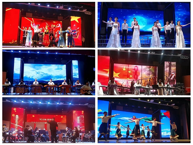 为期一周的展演活动分舞蹈、声乐、器乐三个板块,各专业教师依托音乐学学科资源,深入挖掘音乐教学的思政元素,推出了一个个的精彩节目。杨娟、周婧、吴定博三位器乐老师联袂登台,一曲《东方红》,形象演绎了党的初心使命。表演唱《唱支山歌给党听》以昂扬的歌声抒发“感党恩、听党话、跟党走”的炽热情怀。小组唱《强国一代有我在》,唱出了当代青年作为强国一代的责任担当。舞蹈《维吾尔族姑娘》优美挺拔,藏族舞蹈《格桑花开》热情奔放,古筝和管乐合奏《我的祖国》激情澎湃,表达了浓烈的爱国主义情感。