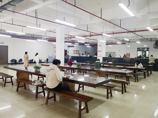 为进一步完善图书馆读者服务功能,满足部分读者大声朗读、休闲和用餐的需求,图书馆在一楼设置了休闲区。近期,图书馆购置了4张6米长实木大板桌和多张配套长凳,对该区域的桌凳进行了统一更换,新的桌凳款式一致、整齐划一,木质纹理流畅,自然色泽温润,尽显图书馆质朴大气风范。用餐时段,读者可以在此就餐,非用餐时段,读者可以在此学习休闲。休闲区临近图书馆报告厅和考研自修室,既满足了读者学习、朗读及用餐需求,又有效改善了图书馆报告厅和考研自修室环境,受到读者一致好评。