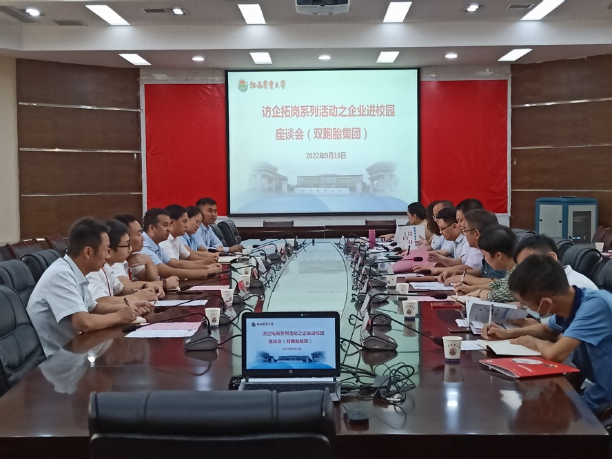 座谈会上,左辉群对熊志华一行来校表示热烈欢迎,并介绍了学校2022届本科毕业生就业基本情况及2023届本科毕业生基本情况;熊志华介绍了双胞胎集团的基本情况、人才政策以及2023年的校园招聘需求;校企双方围绕深化校企合作进行了深入探讨和广泛交流。