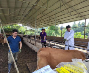 夏季炎热的天气引起的母牛热应激反应给“浮梁铁蹄牛”调研小组带来极大的挑战,铁蹄牛又名“跑山牛”,其长期生活于环山梯田较多,旱地面积大的广丰地区,因此其四肢粗壮、蹄坚耐磨,母牛躁动不安给保定工作造成困扰,固定和称重,需多人合作,成员们不畏困难险阻,齐心协力,攻克难关,给扩繁母牛以及种公牛固定和称重,建立个体档案及家族系谱表。