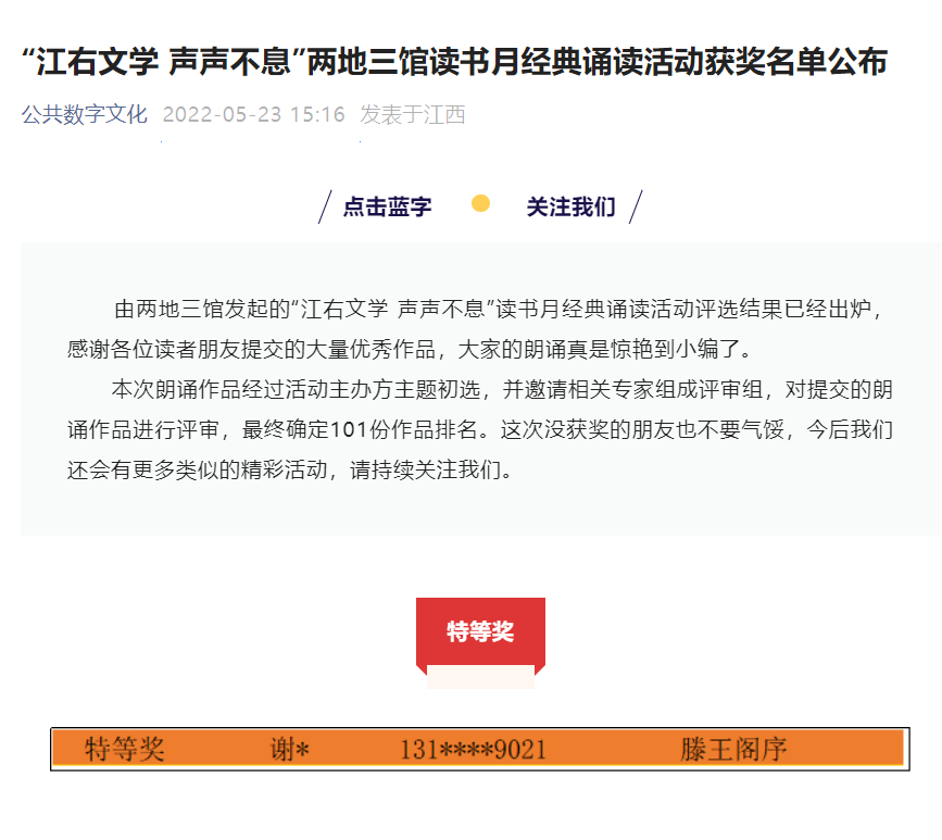 本次活动由江西省图书馆计算机技术部联合南昌市图书馆、九江市图书馆和中国知网联动发起,全省读者广泛参与,朗诵作品经过活动主办方主题初选,并邀请相关专家组成评审组,对提交的朗诵作品进行评审,最终确定101份作品进行排名。谢东睿同学以扎实的朗诵技巧,饱满真挚的情感,完成了《滕王阁序》的诵读作品,赢得了评委和观众的一致好评。