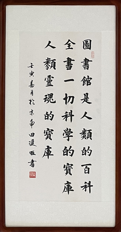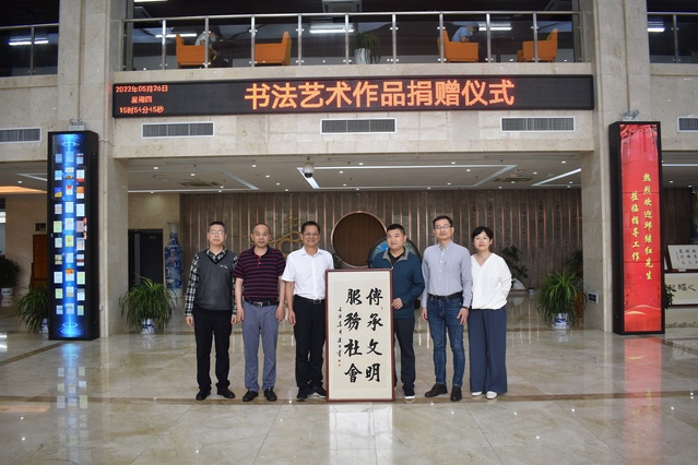 5月26日下午,书法艺术作品捐赠仪式在图书馆举行。捐赠仪式上,中国农牧产业联盟主席、圣羊农业科学院院长、圣羊书画院院长邱继红向图书馆捐赠了书法名家颜世举、田双旺的9幅书法艺术作品,贺浩华副校长代表学校向邱继红颁发了捐赠证书并合影留念,图书馆单位负责人陪同参加。