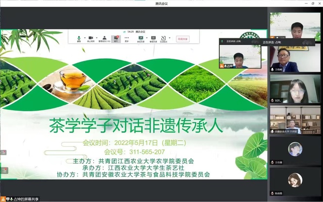 中国茶文化源远流长,传统制茶工艺更是非物质文化遗产中的一大瑰宝。为提升茶学专业学生的专业素养和认知能力,加强对学生劳动教育的体验和宣传,5月17日,农学院与安徽农业大学茶与食品科技学院共同举办了“茶学学子对话非遗传承人”主题线上交流会。安徽省级非物质文化遗产代表性项目绿茶制作技艺传承人王晓峰、安徽农业大学茶与食品产业化研究所所长宁井铭、欧冠大学生茶艺社指导教师刘洋与两校300余名学生共聚云端,共话传统手工制茶工艺。