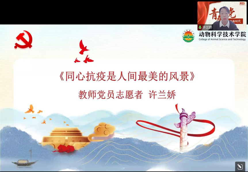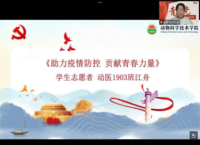 在五四青年节来临之际,动科院红色先锋党小组善作善成,将抗疫的实践案例融入课堂,向广大青年学子讲好抗疫这堂“大思政课”,春风化雨,直抵学生心灵。5月3日下午,“‘疫’线闪耀彰显使命担当,师生聚力筑牢安全屏障”为主题的大思政课“云端”开讲,校团委副书记王成斌及动科院师生志愿者代表许兰娇、江舟为300余名学生共同授课,师生凝心聚力、共克时艰的抗疫实践,成为最生动的思政教材。