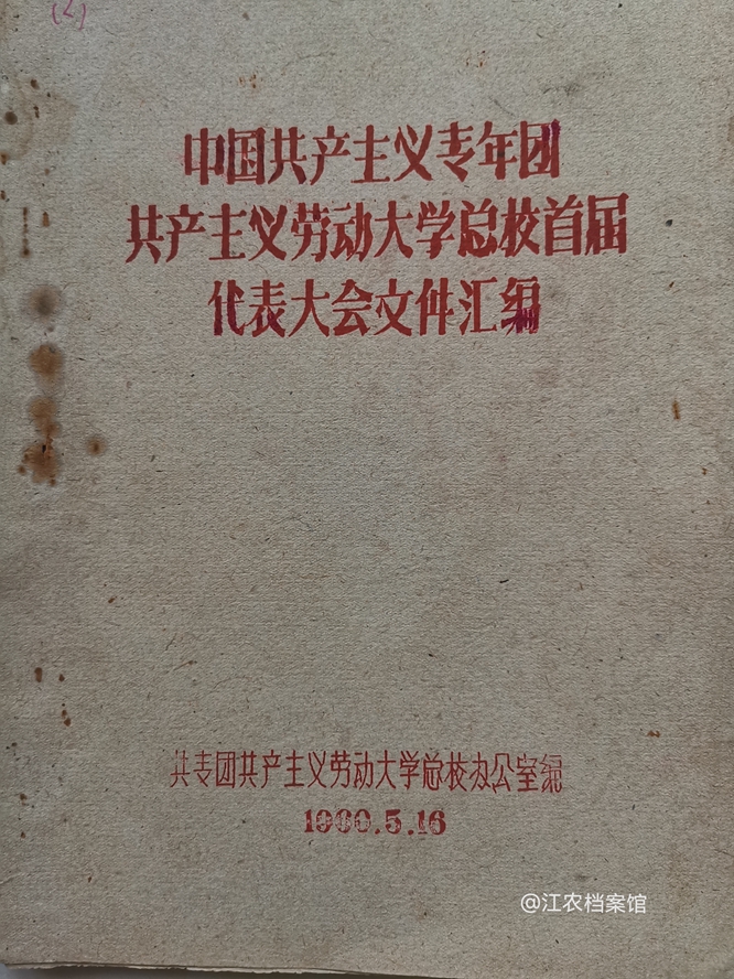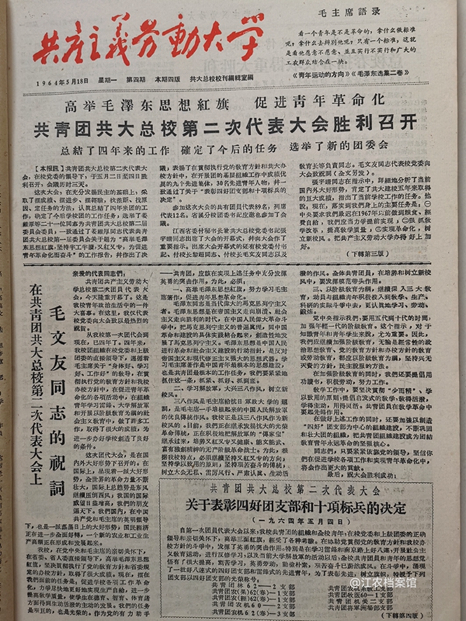 1960年5月4日,共青团共产主义劳动大学总校首届代表大会隆重开幕。出席大会的有各系团总支、支部的团员代表142人,部分分校团委同志及首次评选为全校“五好学生”和“红旗班”的代表列席了大会。
