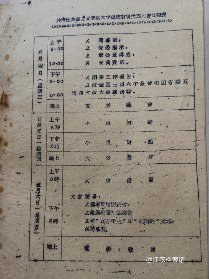 首届团代会开了三天,5月4日开幕,5月6日闭幕。会议议程有:致开幕词、党委指示、领导讲话、来宾致词、团委工作报告、传达团三届六中全会和团省委五届四次扩大会议精神、小组讨论、大会发言、选举首届团委会、通过决议、向“五好学生”和“红旗班”颁奖、致闭幕词。会议期间,为丰富学生生活,还安排了两场电影晚会。