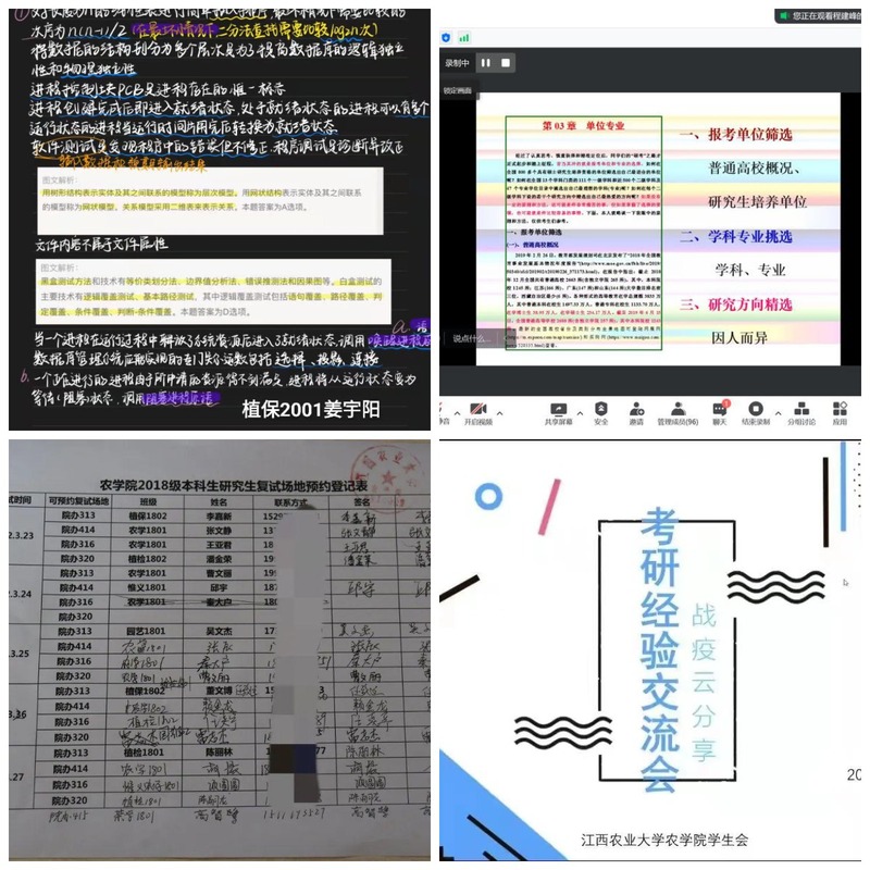 “仔细、全面、重点明确”,这是同学们对植保2001班姜宇阳网课笔记的评价。为引导全体学生以学习为主业,提升网课学习效果,农学院学生会举办了“优秀网课笔记评选活动”活动,同学们纷纷在朋友圈、QQ空间中展示自己的网课笔记,大家互相勉励、互相鼓舞,彼此分享学习经验和方法。为保证课堂教学质量,提升学生的网课获得感,教学办和学工办联合开展网课教学和学生线下学习状态督导检查,学院教学督导员线上听课,同步进行课堂教学质量评价工作。学院领导和辅导员走进寝室,了解同学们学习形式和上课体验,勉励同学们珍惜时间,把握当下,切实做到抗“疫”和学习两不误。