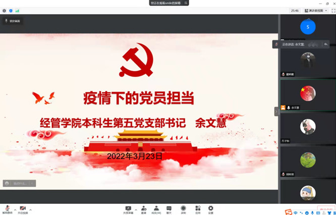 3月23日晚,经管学院本科生第五党支部在线上开展“守初心、担使命、亮承诺”线上主题党日活动,一堂线上党课《疫情下的党员担当》火热开讲。