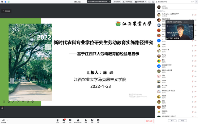 1月23日,由学位与研究生教育杂志社和北京理工大学研究生教育研究中心主办,北京大学中国博士教育研究中心、北京师范大学高等教育研究院等单位协办的全国第五届研究生教育学研究生学术论坛在线上举行。欧冠马克思主义学院2020级思想政治教育专业研究生陈琛撰写的论文《新时代农林高校专业学位研究生劳动教育实施路径探究——基于江西共大劳动教育的经验与启示》(刘圣兰教授指导)获评优秀论文并受邀作报告。