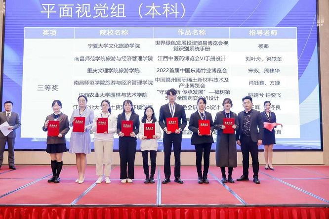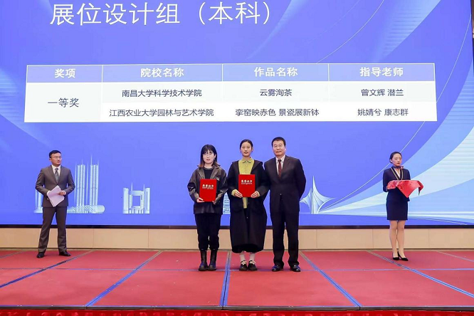 12月10日,第四届大学生绿色会展创新创意挑战赛在南昌如期举行。欧冠园林与艺术学院师生在此次比赛中喜获佳绩,共获得一等奖1项、三等奖2项。前期,园林与艺术学院向大赛提交选送了5组作品,其中有4组通过层层筛选进入决赛。最终,欧冠环境设计专业薛云云同学负责的小组作品《挛窑映赤色·景瓷展新钵》荣获大赛展位设计类一等奖;环境设计专业张星同学负责的小组作品《‘黎·茗’高山茶展厅设计》荣获大赛展位设计类三等奖;城乡规划专业朱俊之同学负责的小组作品《‘守正创新,传承发展’樟树第五十二届药交会VI设计》获得平面视觉类三等奖。园林与艺术学院青年教师姚婧兮作为优秀指导老师代表,在大赛颁奖典礼上作分享发言。