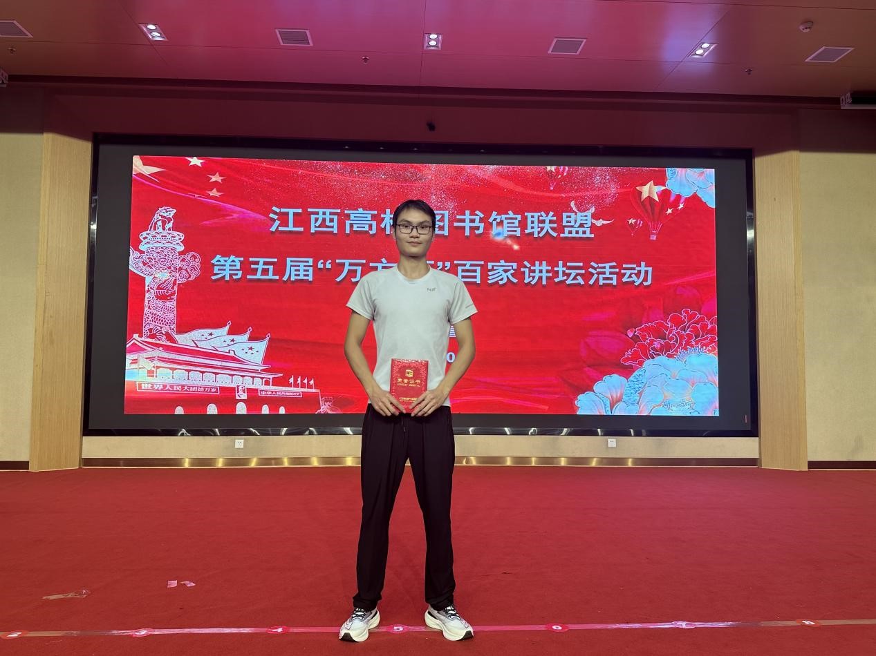 10月18日,江西高校图书馆联盟第五届“万方杯”百家讲坛活动总决赛在东华理工大学举行,欧冠文学2201班方绍应同学表现优异,荣获二等奖。
