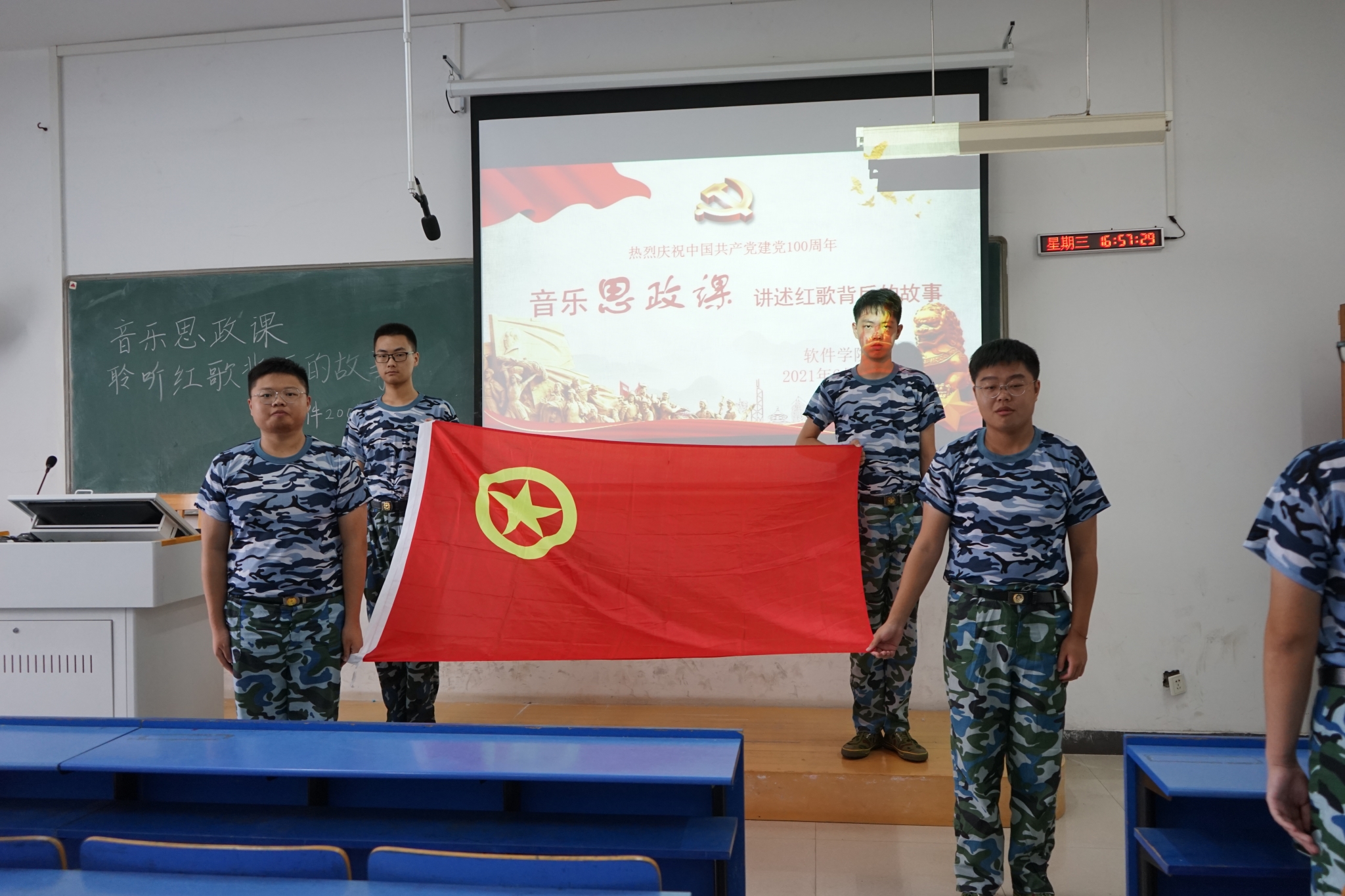 上一堂音乐思政课。6月30日下午,以20级新生军训为契机,开展《音乐思政课,走近红歌背后的故事》主题活动,组织各班学唱《没有共产党就没有新中国》、《歌唱祖国》 两首红歌,并从创作背景、历史意义等方面讲述两首红歌背后的故事,厚植团学青年的爱国主义情怀。