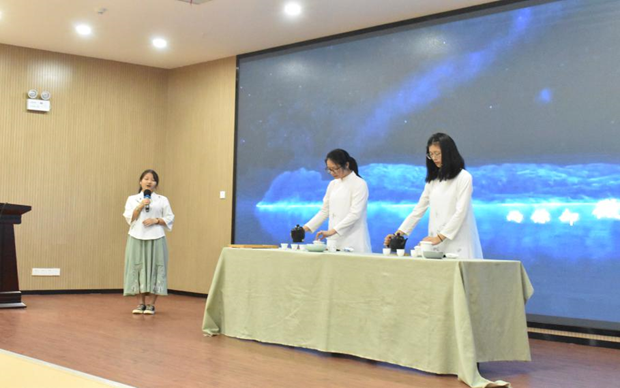 伴随着悠扬的歌声,茶艺社带来了精彩的茶艺表演,同学们动作娴熟优美,中华博大深远的茶文化在手指及杯盏间流淌,给大家带来了一场视听盛宴。