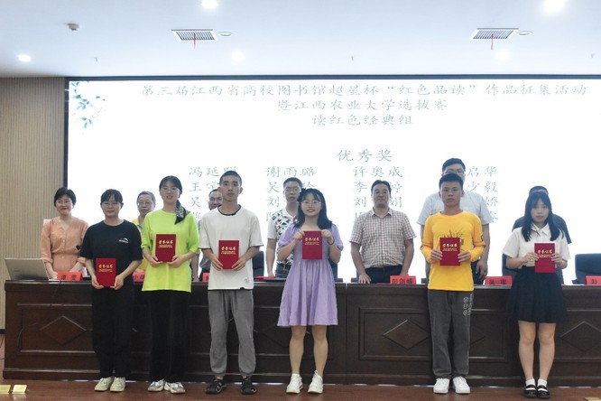大会为获奖人员颁奖,包括第三届江西省高校图书馆超星杯“红色品读”作品征集活动暨欧冠官方网站选拔赛,首届江西高校“知网研学”杯积分挑战赛,“忆峥嵘岁月,看今朝辉煌”庆祝建党100周年线上音视频、书画作品征集活动,“万卷共知”寻知学术文献信息检索大赛,“青春心向党•梅岭诗韵”朗诵大赛,“阅读打卡新姿势,纸电同步自由读”趣味阅读活动,“奔跑吧,阅读马拉松”,“品文学书籍,绘别样思绪”手抄报绘制活动,读者之星、第十二届百家讲坛等活动评选出奖项。此次读书月活动共有20项,还有部分活动暂未结束,将在后期评奖结果揭晓后对获奖人员进行奖励。