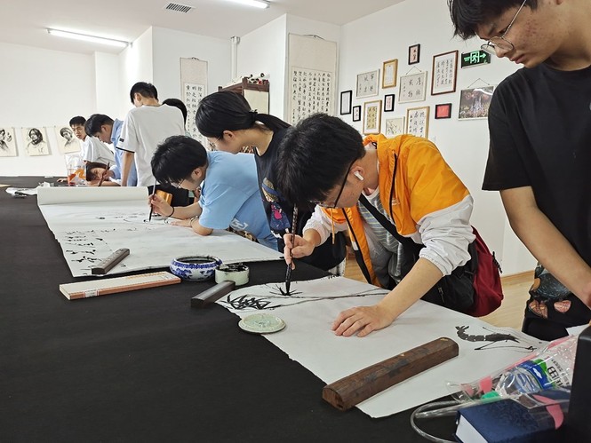 交流会结束后,各校代表团前往新图书馆六楼的墨韵书画协会办公室进行了现场泼墨、亲笔交流,活动现场弥漫着浓厚的书画艺术氛围。在新图书馆二楼自助服务区内设有武汉鼎森电子科技有限公司提供的“博看智能诗书画文创台”,大家纷纷上台体验。