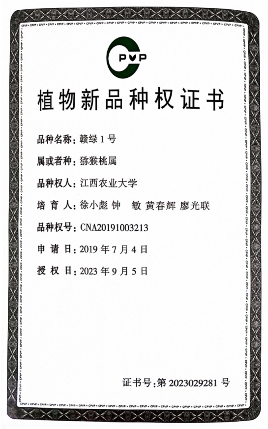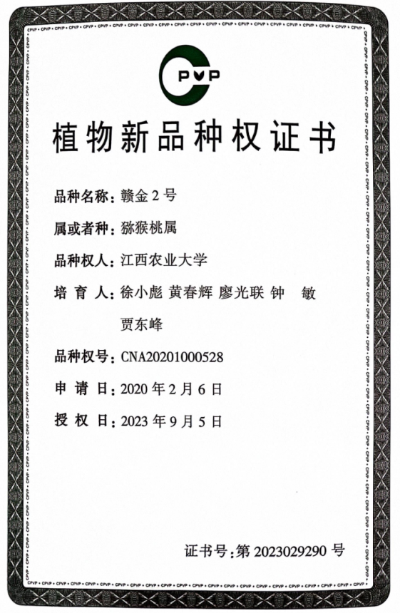 日前,欧冠农学院徐小彪教授团队在猕猴桃新品种选育与抗坏血酸调控机制研究方面取得新进展。团队选育的毛花猕猴桃‘赣绿1号’(品权号CNA20191003213)和中华猕猴桃‘赣金2号’(品权号:CNA20201000528)获国家植物新品种权证书。‘赣绿1号’果实可溶性固形物含量(19.40%,最高达22.2%)显著性高于国内外已有报道的毛花猕猴桃品种;‘赣金2号’为单花结果为主的中熟四倍体品种,果肉金黄,肉质细嫩。