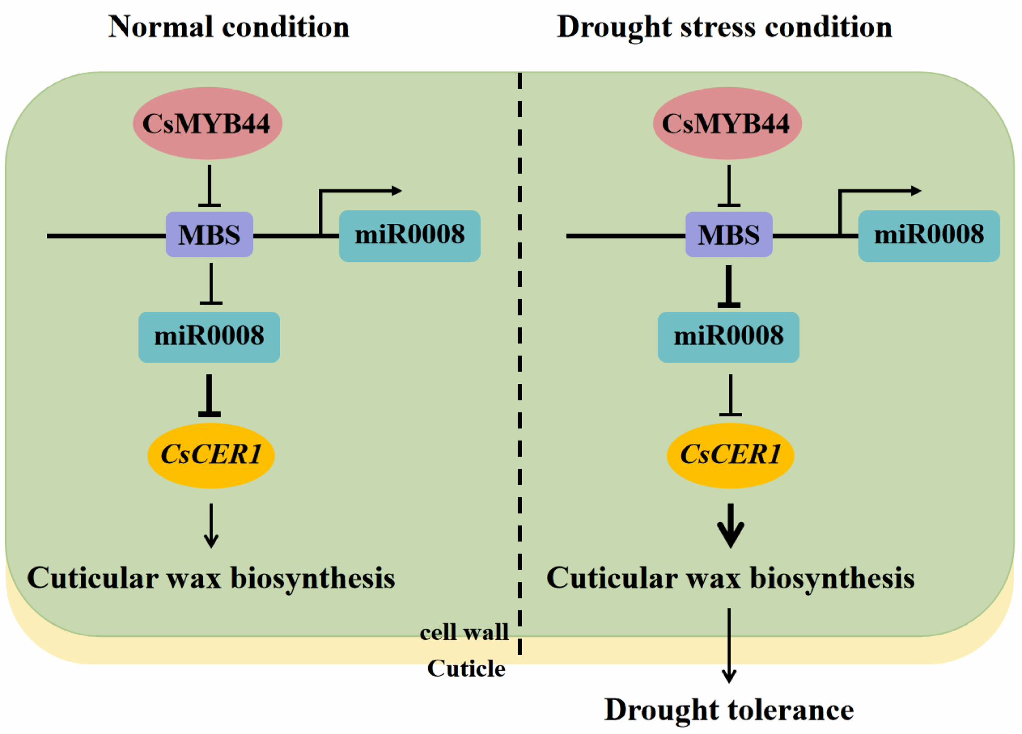 研究团队利用miRNA-seq技术分析了来自不同发育时期(花后60天、120天和210天)‘纽荷尔’脐橙及其蜡质缺失型突变体‘赣脐3号’果皮中的差异表达miRNA。鉴定到一种新的miRNA——csi-miR0008,其靶向调控蜡质合成关键基因CsCER1的表达。通过转基因技术验证得到csi-miR0008-CsCER1模块参与调控柑橘表皮合成,从而影响植株对干旱胁迫的响应。此外,发现CsMYB44蛋白能结合csi-miR0008启动子并抑制其表达,且CsMYB44基因正调控柑橘表皮蜡质合成和抗旱性。构建CsMYB44-csi-miR0008-CsCER1模块为在转录后水平调控柑橘表皮蜡质合成提供了新见解,也为选育耐旱性强的柑橘新品种提供了基础。该研究成果以“The CsMYB44-csi-miR0008-CsCER1 module regulates cuticular wax biosynthesis and drought tolerance in citrus”为题于3月28日在《New Phytologist》在线发表。刘勇教授和刘德春教授为文章的共同通讯作者,博士研究生谢婧蘅为文章的第一作者。