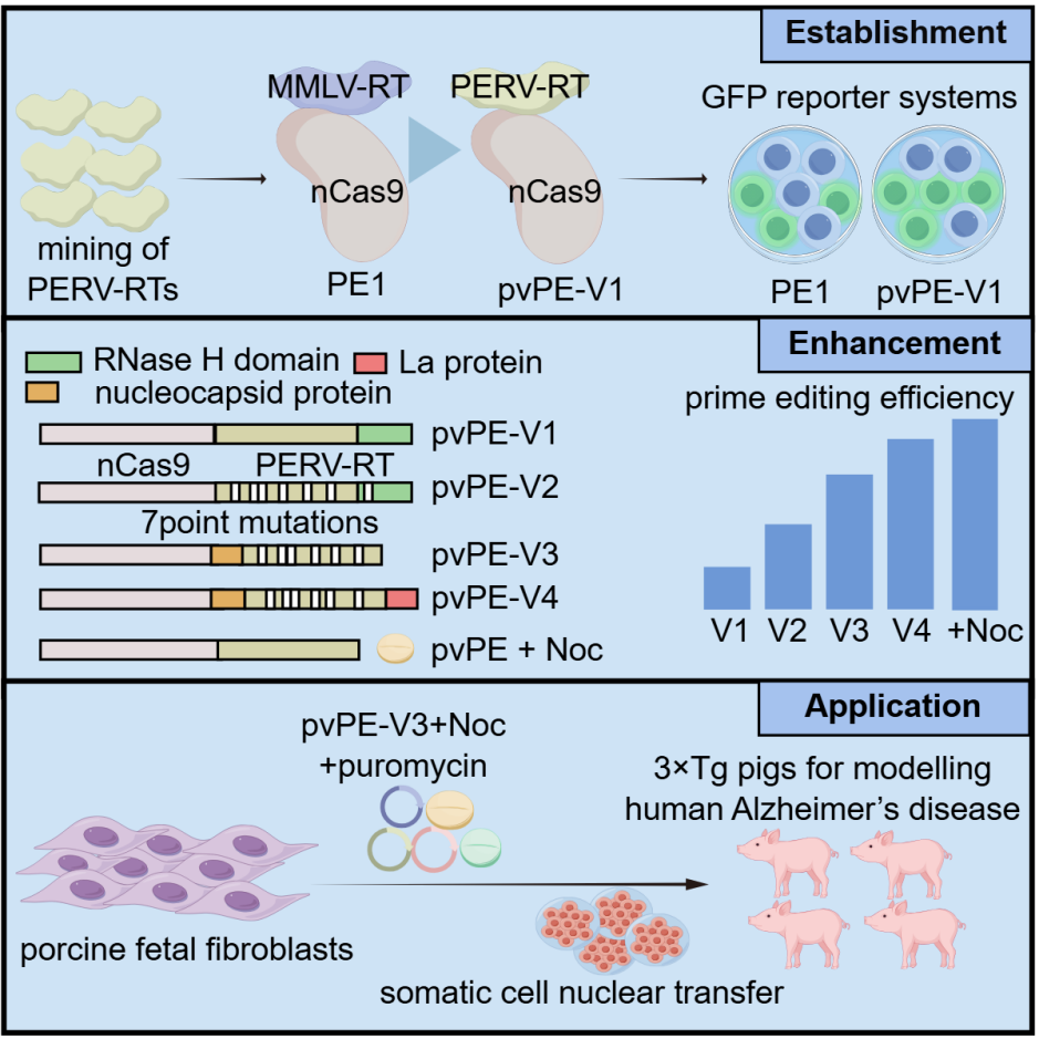 先导编辑(Prime editing, PE)是近年来由基因编辑领域国际知名科学家David Liu团队率先开发、并获得迅速发展的新型基因组编辑技术,可以在不引起DNA双链断裂的情况下实现精准的插入、替换和缺失等多种编辑类型,被誉为“万能型”基因编辑工具。然而,该技术目前仅在HEK293T等少数细胞系中展示出较高的效率,在猪等大型农业动物中的编辑效率比较低下,成为限制其广泛应用的重要因素。逆转录酶(RT)作为PE系统的核心组分,其活性是影响编辑效率的关键。目前主流PE系统采用的逆转录酶主要来源于鼠白血病病毒(MMLV),国际上虽有不少课题组尝试挖掘新的RT用于PE系统,但效率始终未能超越基于工程化的MMLV-RT。因此,开发高活性的全新RT成为推动PE技术突破,尤其是将其应用于家猪等大动物基因编辑的迫切需求。