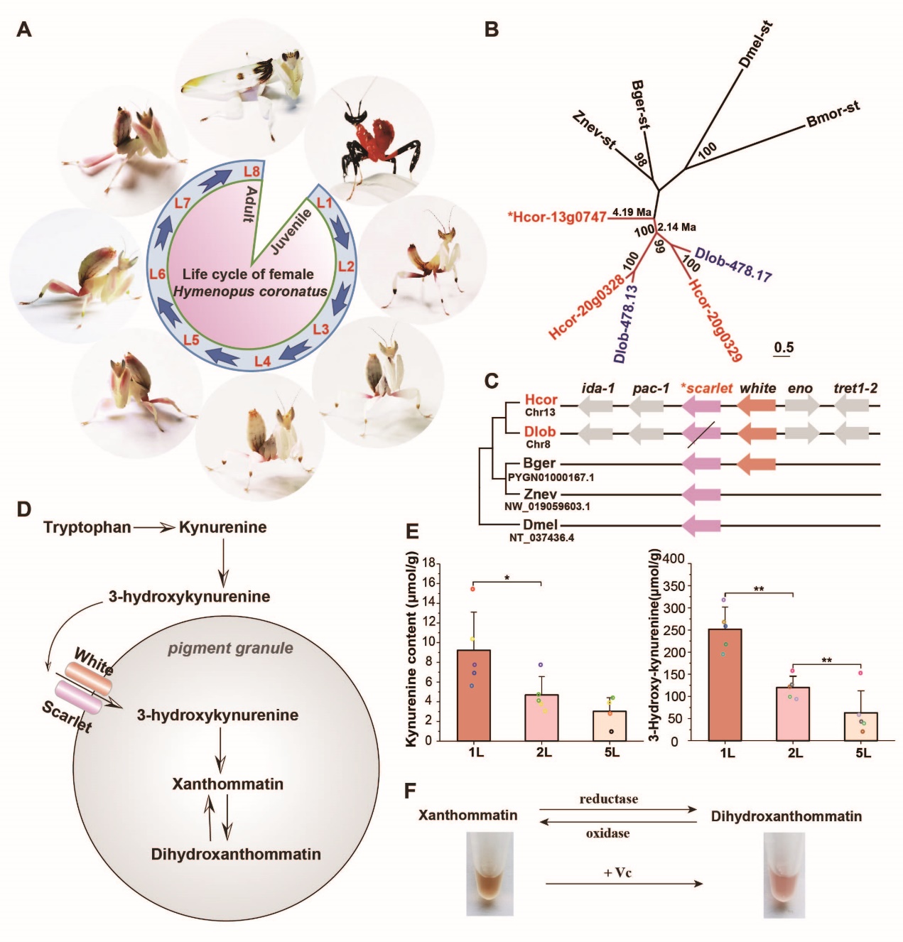 该研究利用比较基因组和生化手段,揭示了兰花螳螂发育过程中独特的颜色变化:一龄幼虫呈现红黑色,模仿有毒的猎蝽,采取警戒色的生存策略;从二龄幼虫阶段,开始模仿花朵,呈现白色或粉色。基因家族分析显示,ABC超家族中Scarlet与White在兰花螳螂中显著扩张,两者可结合形成异二聚体,将3-羟基犬尿氨酸运输到色素颗粒中合成眼黄素。生化实验和高效液相色谱测定分析进一步证实了眼黄素是兰花螳螂颜色伪装的关键色素。
