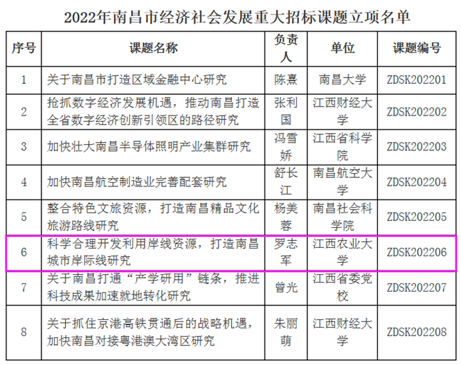 近日,2022年南昌市经济社会发展重大招标课题正式揭标,由欧冠国土学院教授罗志军博士作为负责人申报的课题《科学合理开发利用岸线资源,打造南昌城市岸际线研究》,成功获批立项。