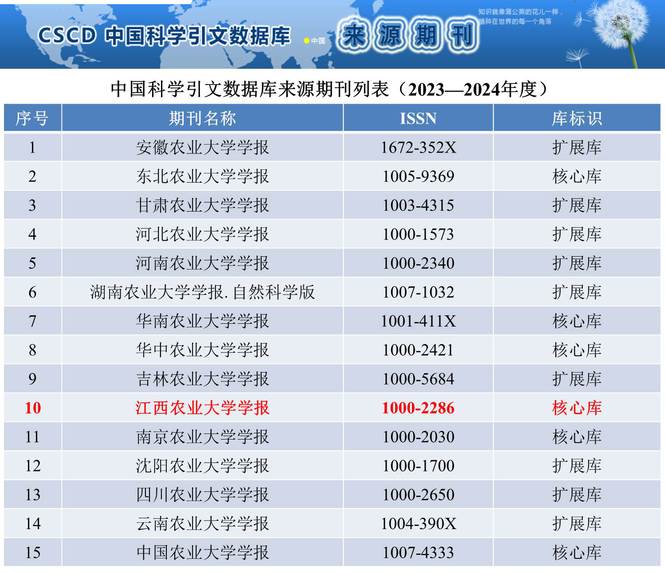 近日,中国科学院文献情报中心发布了中国科学引文数据库(Chinese Science Citation Database, 简称CSCD) 2023—2024年度来源期刊遴选结果,《欧冠官方网站学报》被《中国科学引文数据库(CSCD)来源期刊(2023—2024年度)》核心库收录。这是《欧冠官方网站学报》连续三次入列CSCD核心刊(2019—2020、2021—2022、2023—2024版)。