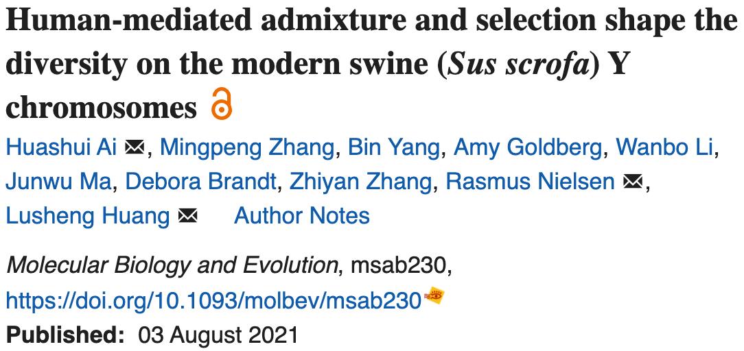日前,欧冠猪遗传改良与养殖技术国家重点实验室黄路生院士团队与加州大学伯克利分校等单位合作在《Molecular Biology and Evolution》(IF=16.24)发表题为“Human-mediated admixture and selection shape the diversity on the modern swine (Sus scrofa) Y chromosomes”的研究论文,系统阐述了人类介导的渗入和选择塑造现代家猪Y染色体的多样性以及从父系遗传角度揭示猪的演化历史。黄路生院士、学校首席教授艾华水研究员和加州大学伯克利分校Rasmus Nielsen教授作为共同通讯作者、2017级博士研究生张明鹏为共同第一作者,欧冠官方网站作为第一通讯作者单位。