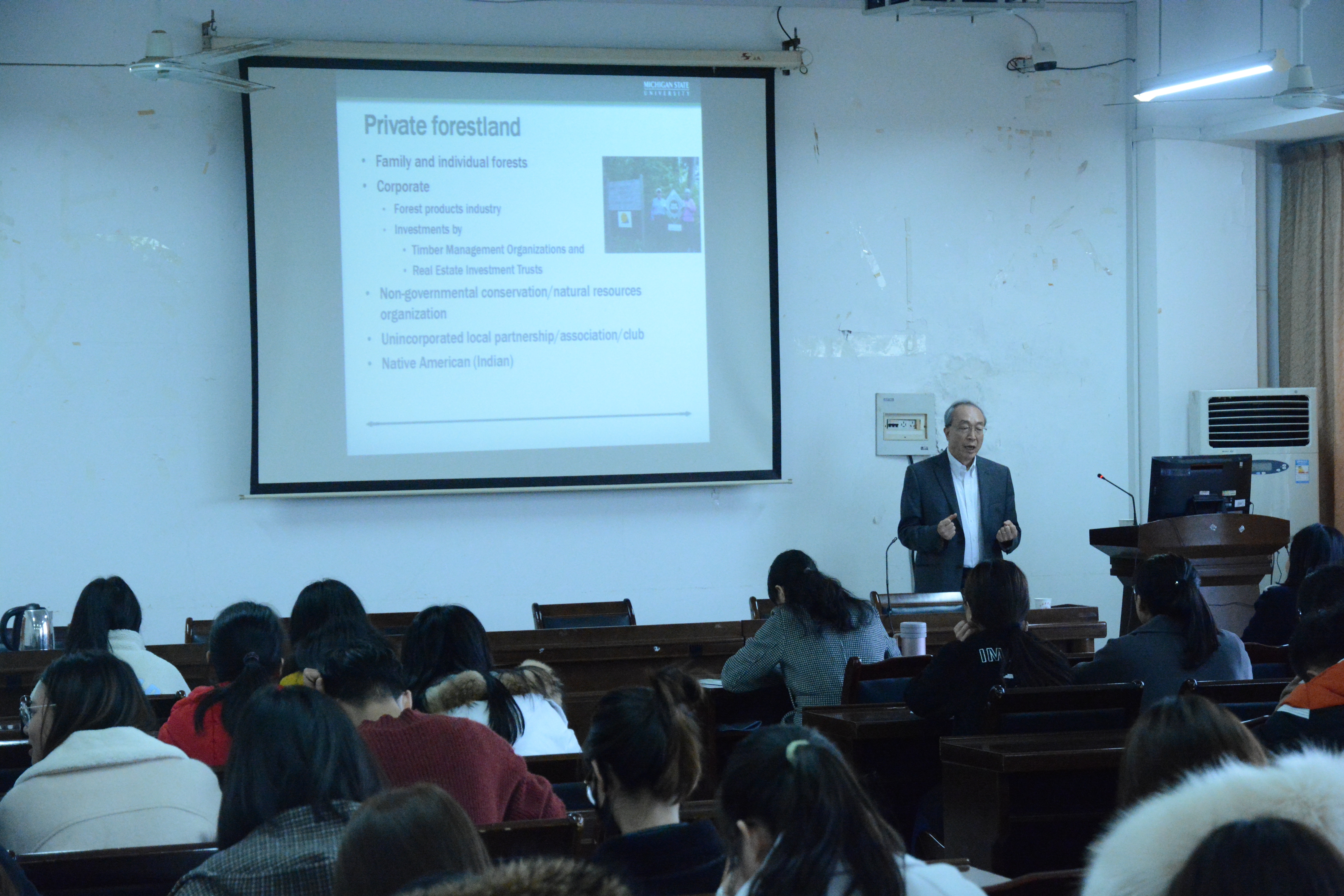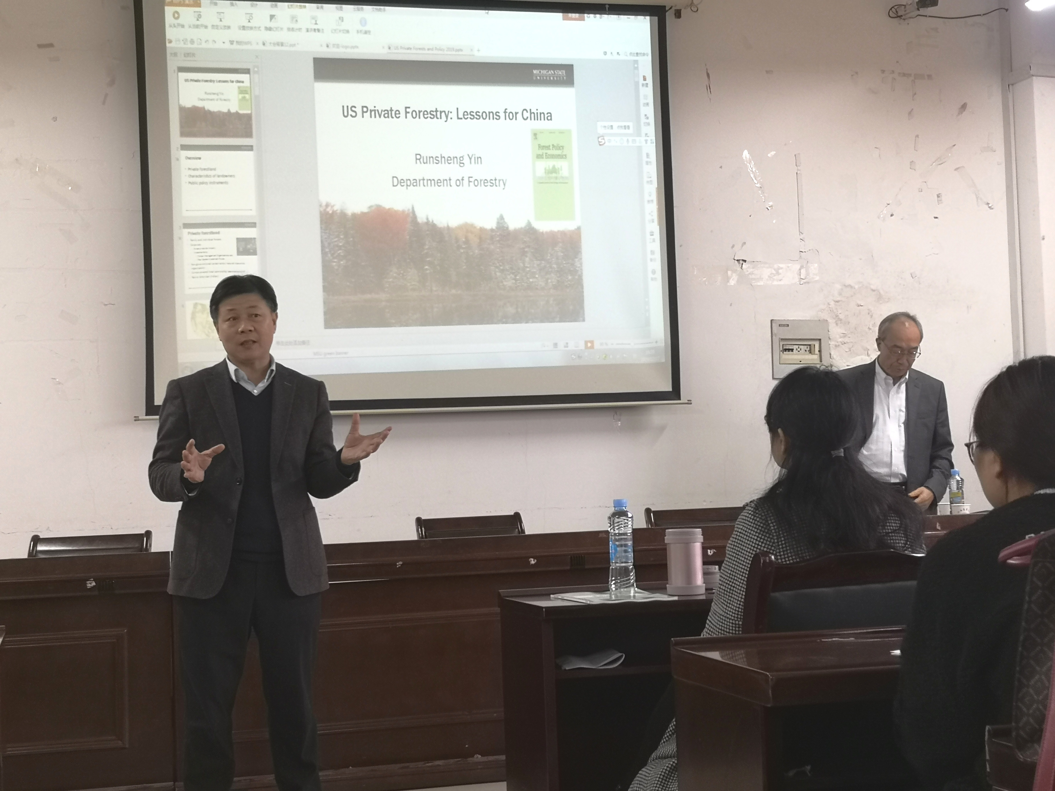 尹教授就“US Private Forestry: Lessons for China”与大家进行了学术交流,对美国私人林地的规模、经营方式、林主关心的问题、美国林地经营政策及相关法规等情况进行了深入细致的介绍并对美国林地经营中存在的问题及对中国的借鉴进行了探讨。报告结束后,朱述斌教授对报告进行了总结,并鼓励大家广泛阅读、勤于思考、善于提问,利用好学院提供的学术资源进行自我提升。此次学术交流极大地提高了与会者对美国林地经营的方式及相关政策的了解,拓宽了与会者科学研究的国际视野。
