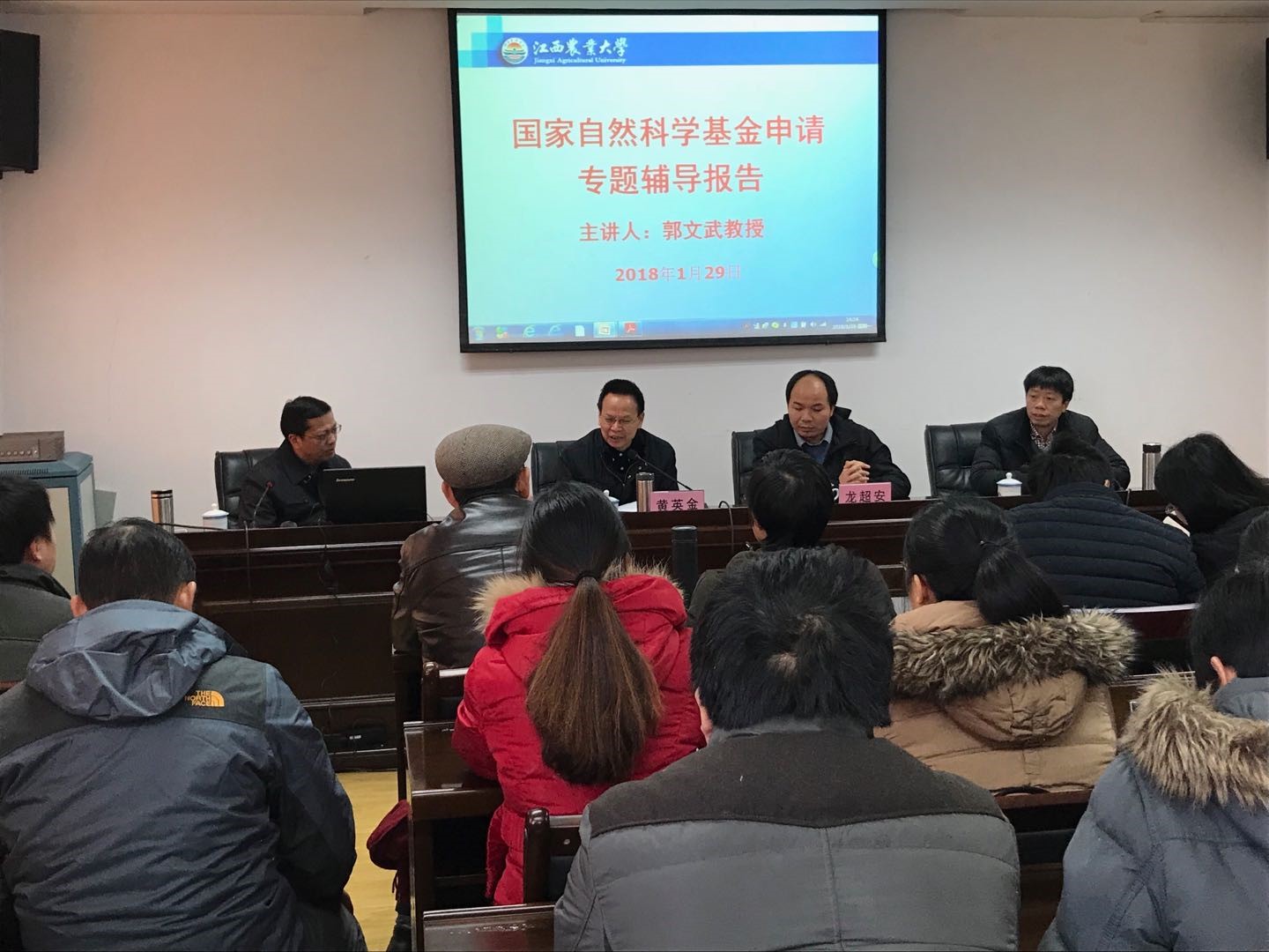 1月29日下午,为进一步推进2018年度国家自然科学基金项目的组织申报工作,科技处邀请国家杰出青年基金获得者、华中农业大学博士生导师郭文武教授来校作“国家自然科学基金申请”专题辅导报告。校长助理龙超安、科技处负责人及相关学院的老师参会。报告会由副校长黄英金主持。