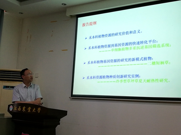 6月19日下午,中科院上海辰山植物科学研究中心研究员、校长助理储昭庆在教育部作物生理生态与遗传育种重点实验室为师生作题为《禾本科植物种质资源创新的基础研究》的学术报告。副校长贺浩华主持报告会,农学院相关专业师生聆听报告。