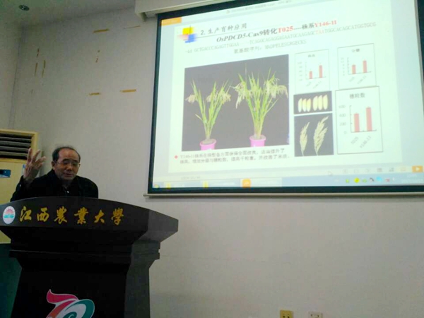 杨金水教授首先介绍了基因组编辑技术以及其研究团队关于RRM2结构域负向调控棉花、油菜和水稻的细胞大小及其调控通路方面的研究;随后,他详细介绍了水稻中一个与细胞死亡相关的OsPCD5基因的表达量与水稻产量呈负相关,通过干扰该基因可大大提高水稻产量,目前已在生产中得到证实。最后,他阐述了非编码lncRNA的特点及调控水稻产量的可能机制。整场讲座生动活泼,深入浅出,使师生们受益匪浅。