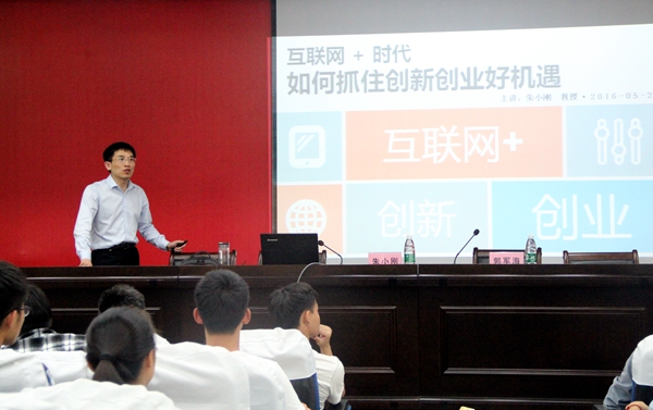 5月24日晚,“互联网+”创新创业专题报告会在欧冠校办一楼报告厅举行。中国大学生互联网+创新创业大赛专家委员会委员、江西省十大IT青年、南昌大学大数据研究中心主任朱小刚教授应邀作了题为《互联网+时代,大学生如何抓住创新创业好机遇》的讲座。来自各学院的200多名同学聆听了报告。报告会前,副校长许斌华亲切接见了朱小刚一行。