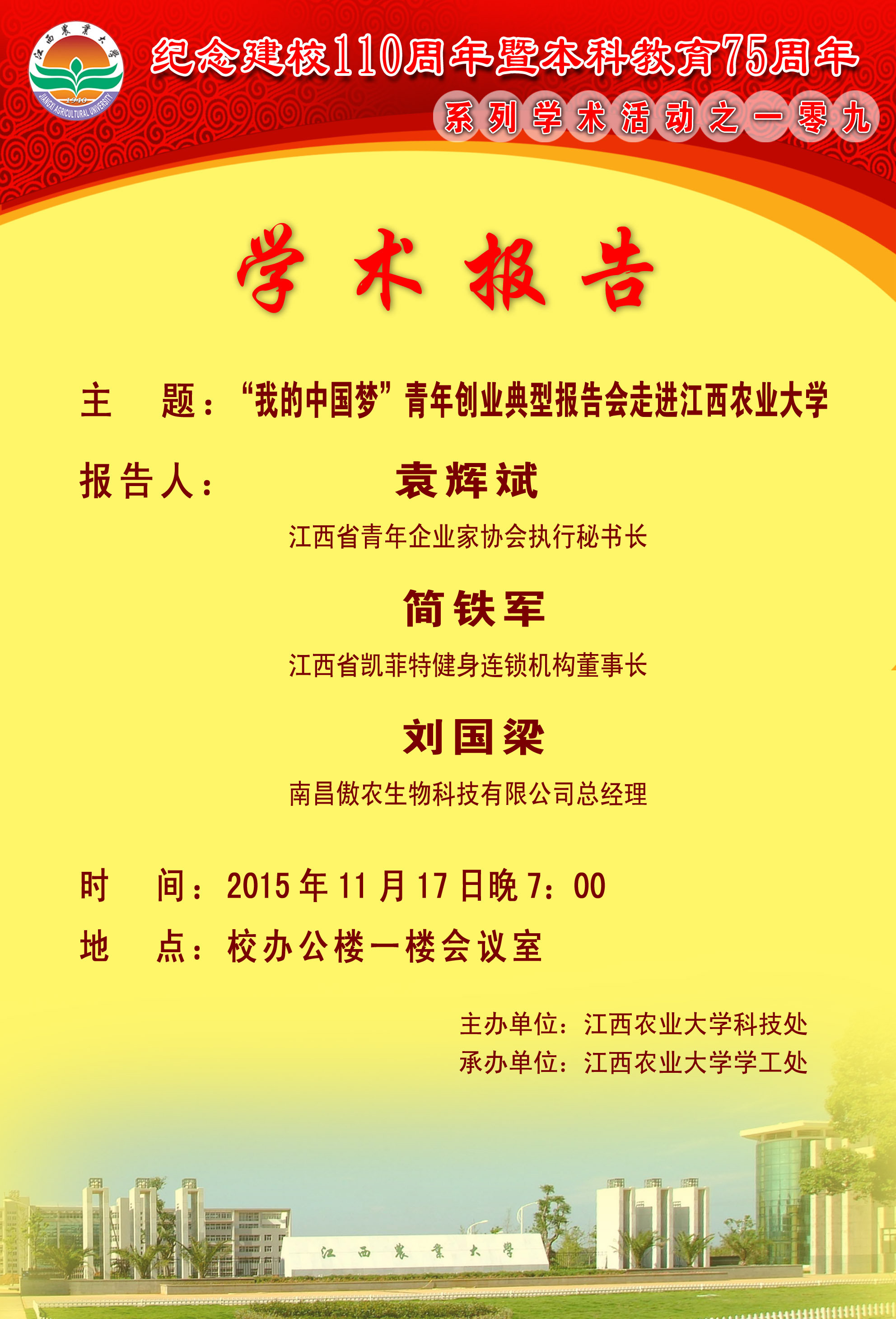 学术报告海报:“我的中国梦”青年创业典型报告会走进欧冠官方网站