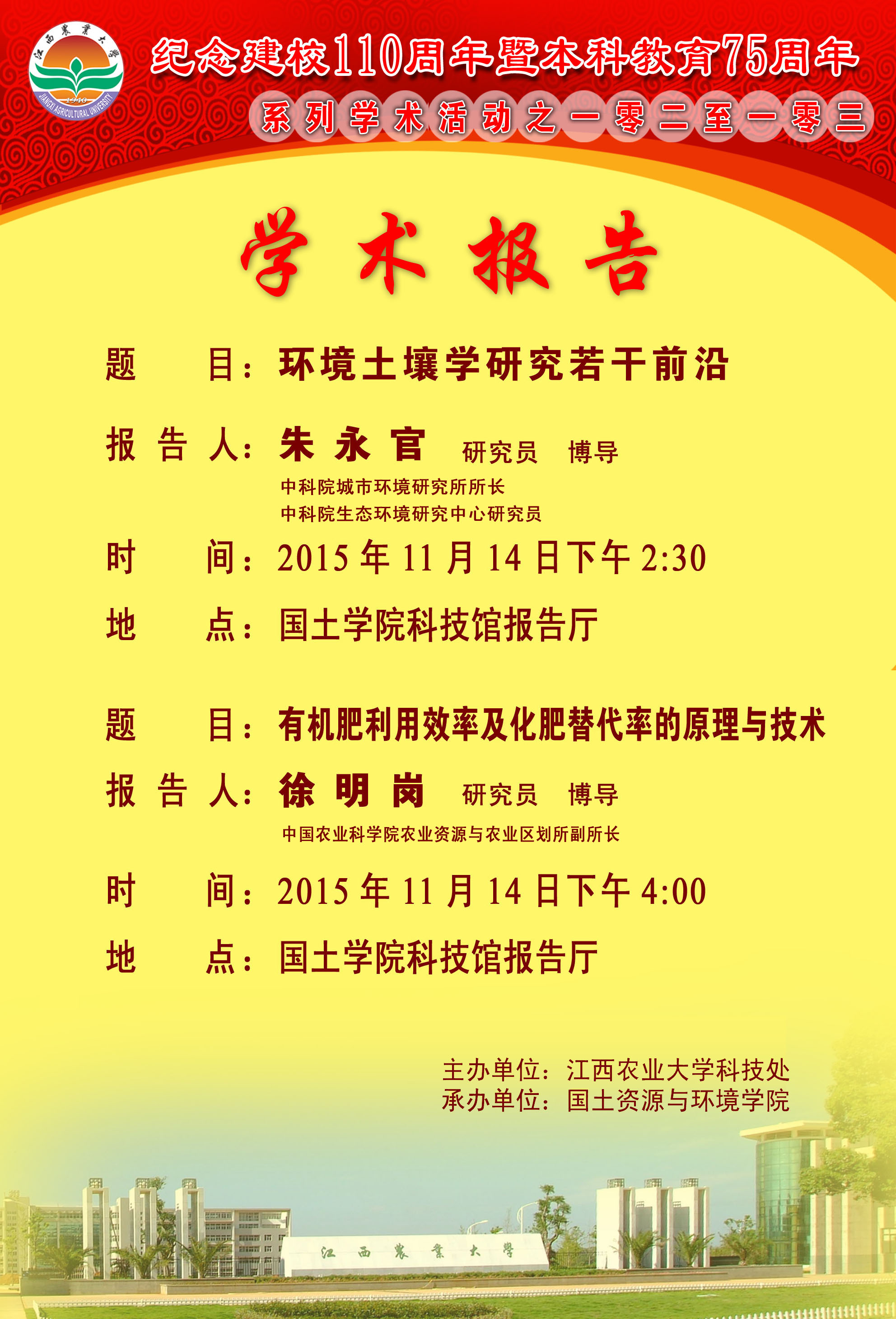 学术报告海报:1. 环境土壤学研究若干前沿 2. 有机肥利用效率及化肥替代率的原理与技术
