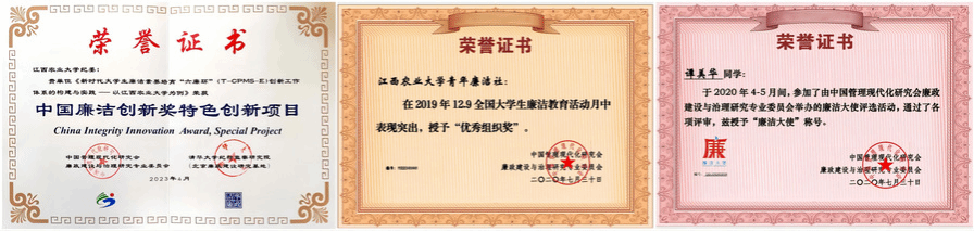 涵养廉洁文化,精心厚植廉洁沃土。校纪委注重正本清源、固本培元,不断强化新时代校园廉洁文化建设。坚持创新工作机制,大学生廉洁教育“六廉环”工作体系入围第三届“中国廉洁创新奖”特色项目,系全省唯一获评单位。常态化举办廉洁文化作品展和主题征文活动,形成校园浓厚崇廉尚洁氛围,选送作品在第五届全国“玉琮杯”微廉政电影大赛中取得突破性成绩,获银奖1个,铜奖2个;在“加强廉洁文化建设 全面建设勤廉江西”主题征文中荣获优秀奖一篇。持续抓好青年廉洁社的指导工作,举办“廉洁新星”“我为廉洁代言”等活动,培育学校廉洁新风,厚植廉洁沃土。
