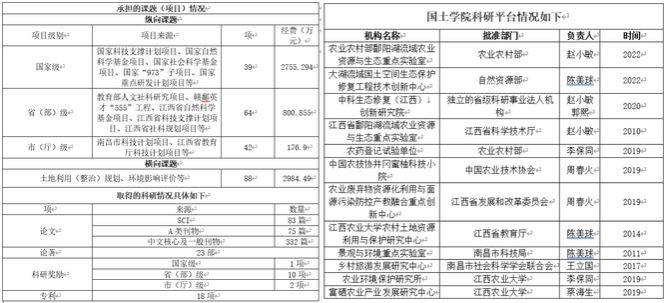 2011年至今,国土学院获批10余项省级及以上科研平台。其中,由赵小敏教授团队牵头申报的“鄱阳湖流域农业资源与生态重点实验室”经过10多年的发展从省级重点实验室成功获批为农业农村部重点实验室(部省共建),近年来依托实验室平台,产出大量科研成果,服务地区发展;由周春火教授牵头的井冈蜜柚科技小院自创立以来已培训果农达200余人,解决实际问题30余项,下乡服务55次,帮扶果农50人次,其中贫困户占40%,先后被人民日报海外版、江西日报等多家媒体关注报道并荣获“十佳中国农技协科技小院”称号“全国最美科技小院”称号。2016年以来,学院在科技支农中不断创新方式方法,依托“重点实验室”,“科技小院”等科研平台,产出科研成果,并让科技创新成果更好地服务地方经济发展。