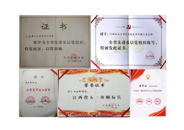 党的十八大以来,农学院党委在“立交桥”、“谷成长”党建理念和工作模式的导航下,组织建设取得了一系列成果。农学院领导班子连续8年获评欧冠官方网站优秀领导班子,学院党委曾荣获全省教育系统“创先争优先进基层党组织”、“全省先进基层党组织”称号。2012年,学院植保系党支部荣获全省“高校先进基层党组织”称号;2019年,学院农学系党支部入选第二批新时代高校党建示范创建和质量创优“全国党建工作样板支部”创建单位,2022年上半年已顺利通过验收,该支部获评2021年“全省先进基层党组织”称号。农学院教师荣获“江西省五四青年”奖章、“新时代赣鄱先锋”、“新时代学生心中的好老师”、“五一巾帼标兵”、“感动江西教育年度人物”、“江西省乡村振兴青年先锋”、“江西省优秀科技特派员”、“全国南繁工作先进个人”、“全省粮食工作先进个人”、“全国模范教师”、“全国优秀教师”、“江西省模范教师、教学名师”、“全省高校优秀共产党员”等省级及以上荣誉和称号60余人次,作物遗传育种团队荣获江西省委教育工委“工人先锋号”称号,作物生理生态与遗传育种教育部重点实验室荣获“全国教育系统先进集体”称号。2014年,学院党员活动室获评“江西省高校示范性党员活动室”。