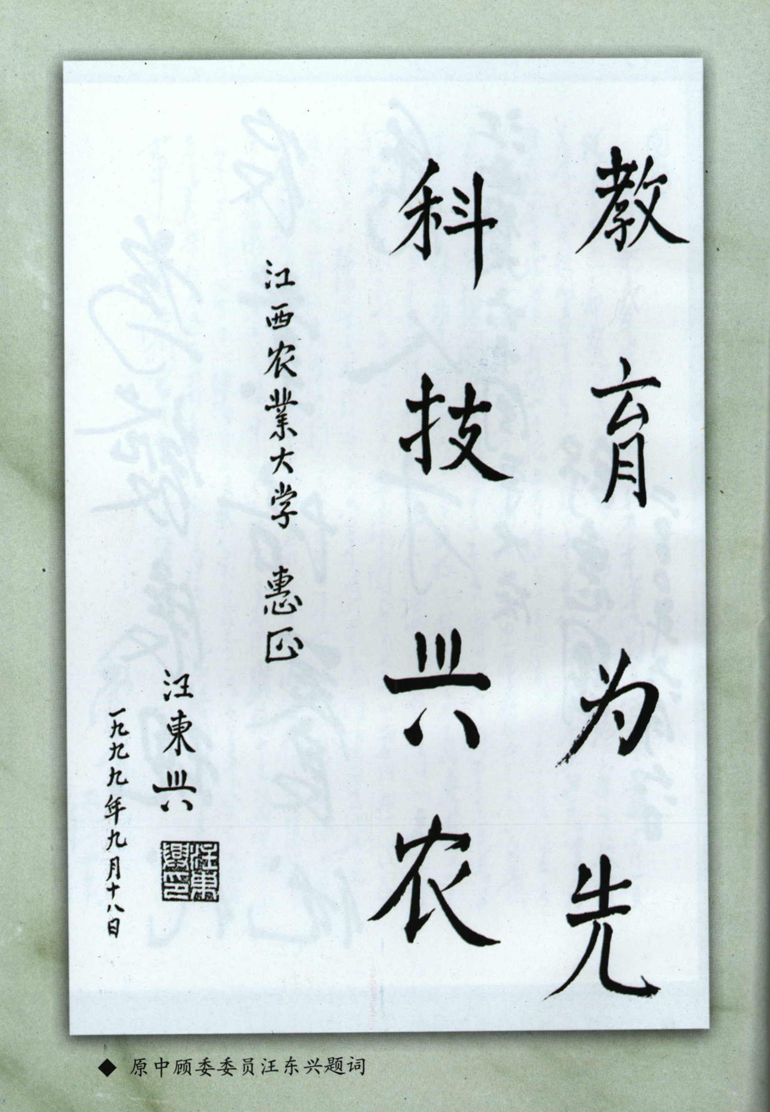 1980年,汪老辞去中央领导职务,从领导岗位退下来,后曾经两次回到欧冠官方网站,深情回忆当年共大工作的场景。每逢学校喜事大事,他都会发来贺信或贺词表示庆贺。每与故人友人谈及共大,汪老都非常激动,经常说:“谈到江西共产主义劳动大学,我的内心都有一种很亲切的感觉,那里毕竟是自己创建并亲身工作过的地方。”可见在汪老的心中,把共大看得有多重!多么牵挂!多么自豪!因为办好共大也是毛主席的心愿所在!而他是毛主席最忠诚的战士!