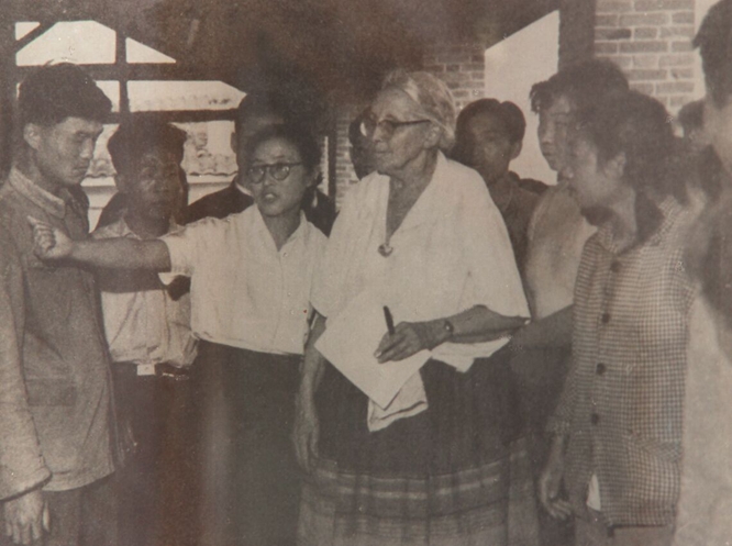 图为1960年5月美国著名作家安娜•路易斯•斯特朗在共大云山分校考察采访