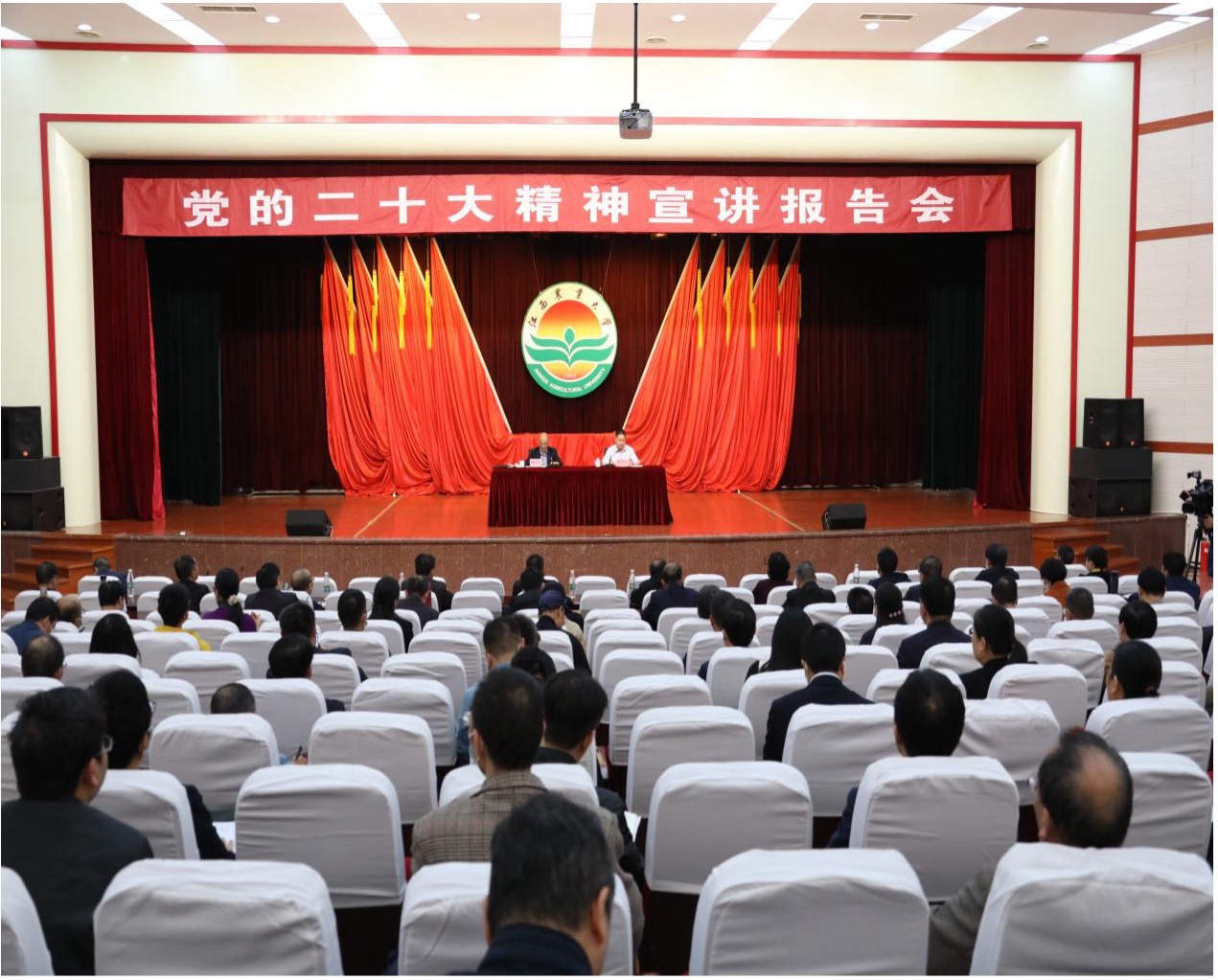 2023年,叶建春省长亲临学校为广大师生作形势报告暨专题党课;2022年,校党委书记黄路生院士与其学生李劲松院士师生同堂为广大师生开讲“爱党爱国 自立自强”新年第一课;2023年,学校面向新生团员青年开展“唱响青春乐章,梦想从江农启航”开学第一课......一堂堂精彩生动的思政课,反响热烈、影响深远,指引学生扣好人生第一粒扣子,争做有理想、敢担当、能吃苦、肯奋斗的新时代好青年;指引教师加强师德师风建设,争做有理想信念、有道德情操、有扎实学识、有仁爱之心的新时代好老师。学校打造的1项项目获批教育部高校思想政治工作精品项目;1门课程成功入选教育部课程思政示范课程并在“学习强国”慕课平台展播;1门思政课程获省教学成果奖一等奖;选送的多部作品屡获全省“红色走读”系列竞赛活动一等奖。