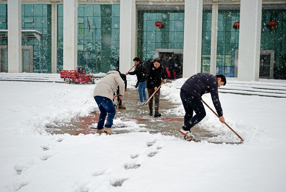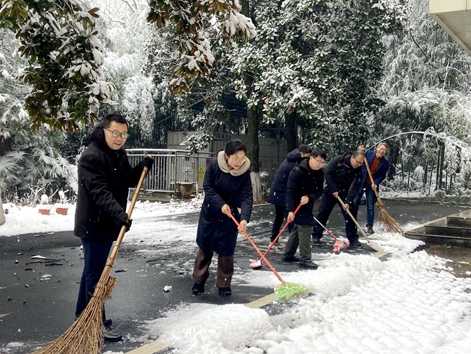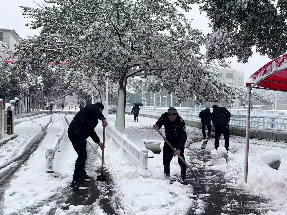 师生们冒着严寒、迎着飞雪,手拿铁锹、扫把等清理工具,齐心协力、通力合作,在办公楼、实验楼、商业街等区域,清理出一条条方便、安全的通道,充分展示了师生积极向上、勇于担当的精神面貌,以实际行动为冬日的校园增添一份温暖。