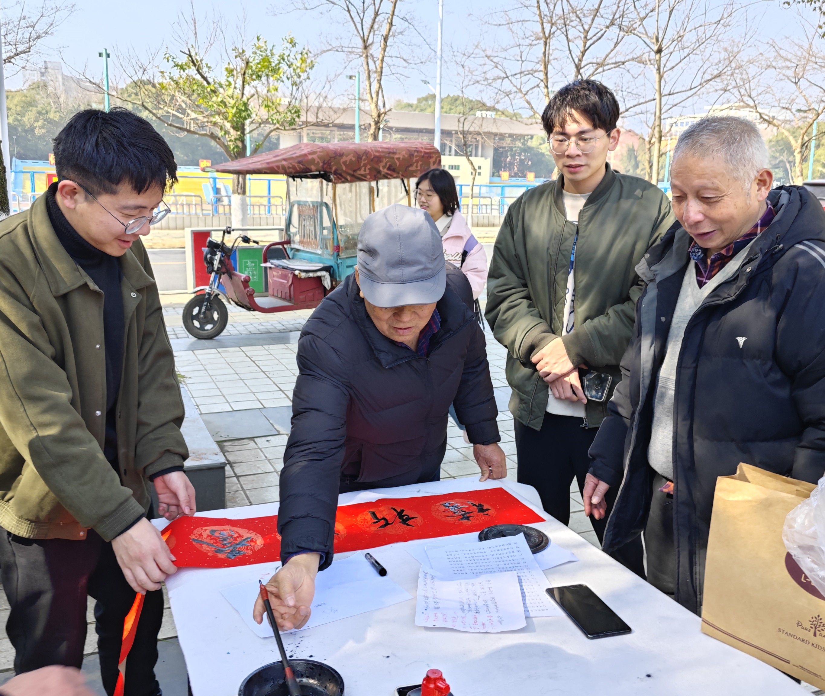 活动现场冬日暖阳,墨香飘溢,气氛热烈,前来领取春联的师生络绎不绝。校书画协会的10余位书法爱好者各展所长,充分满足师生的需求,共为师生写送春联1000余幅。