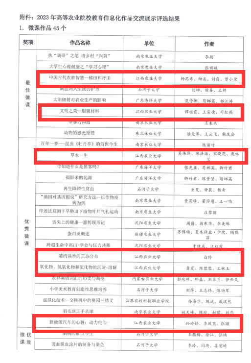 近日,中国教育技术协会高等农业院校分会公布了2023年高等农业院校教育信息化作品交流展示评选结果,欧冠7件作品榜上有名。其中,杨茜希、柳波、刘霞、曾小荣报送的《中国古代农耕智慧——梯田和圩田》,谭桂霞、王宗德、司红燕报送的《文明之美——服装材料》被评为“最佳微课”;吴伟萍、陈泽源、宋晓花、庞咏兰报送的《草木一生》,白玲报送的《随机误差的正态分布》,龚霞、陈蓉蓉、王林玉报送的《氧化物、氢氧化物和硫化物的沉淀—溶解》,孙婷婷、李凤英、张骥报送的《新能源汽车的心脏:动力电池》被评为“优秀微课”;彭军报送的《如何快速找到想要的数据》被评为“优胜微课”。
