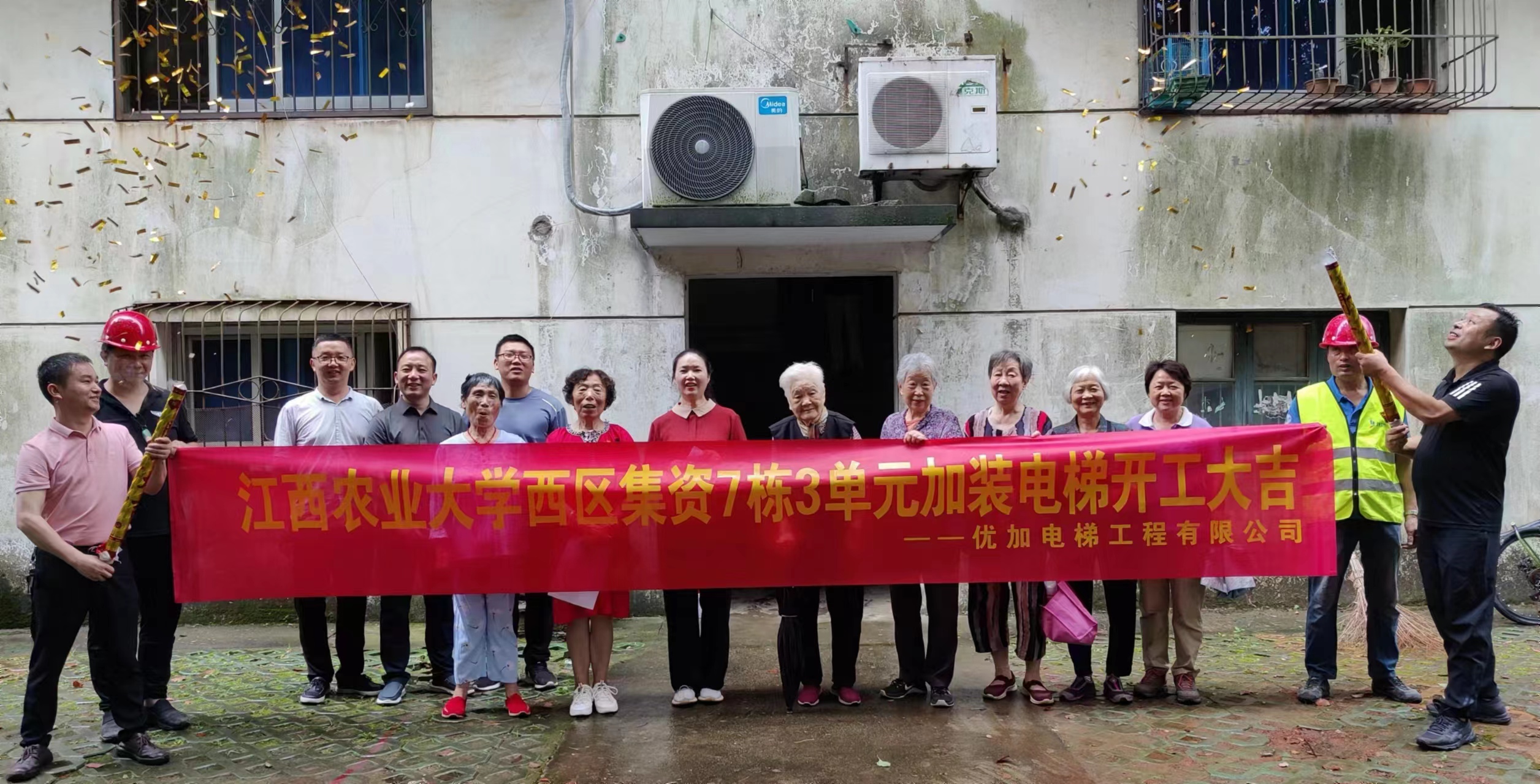 居民们庆祝旧宅装新梯